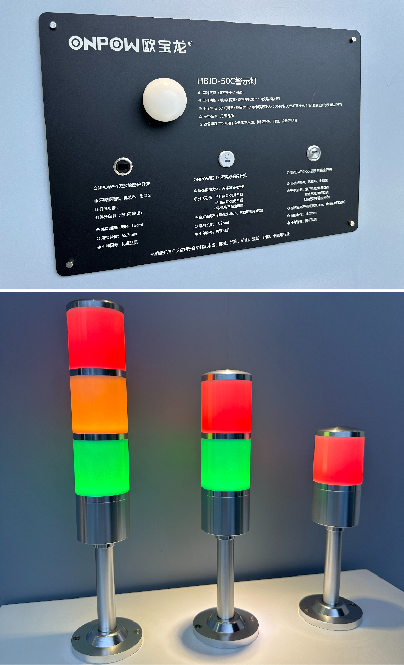 本次展出的非接触感应开关、金属球形警示灯、金属多层警示灯是公司自主研发上新产品,将在今年同步推向国内外市场。其中ONPOW9系列非接触感应开关是公司基于存在“感染风险”场景所研发的开关产品,通过“感应”方式完成开关触发,从而达到“零接触·降低感染风险”目的。产品采用抗破坏不锈钢壳体,感应距离4~15cm可调,电气寿命大于100万次,适用于门禁、无尘车间、食品加工等场所。另两款HBJD-50C系列金属球形警示灯、HBJD-50M系列金属多层警示灯作为HBJD系列(警示灯系列)的扩充,将适配更多使用场景,如AGV、自动化生产线、数控车床等。